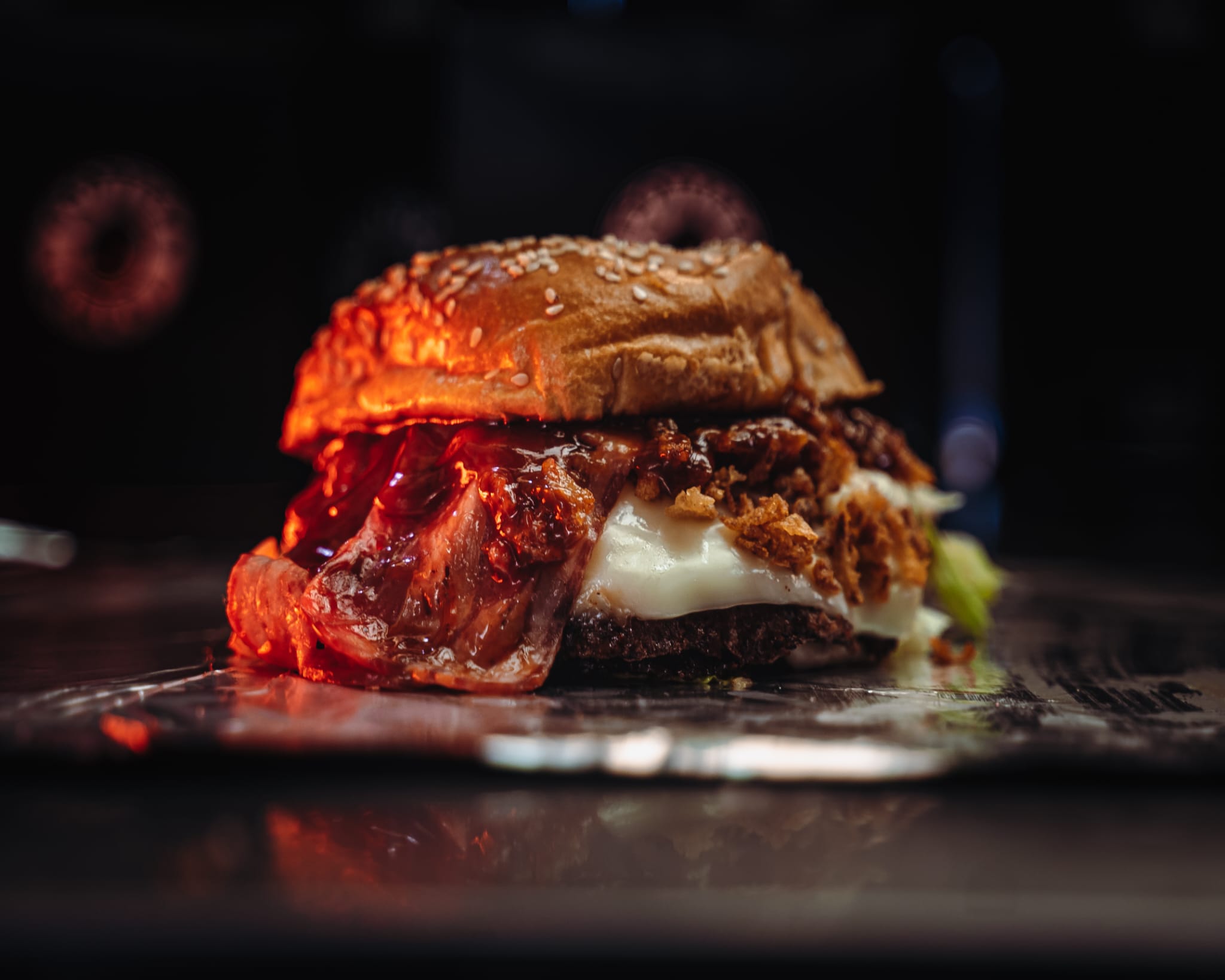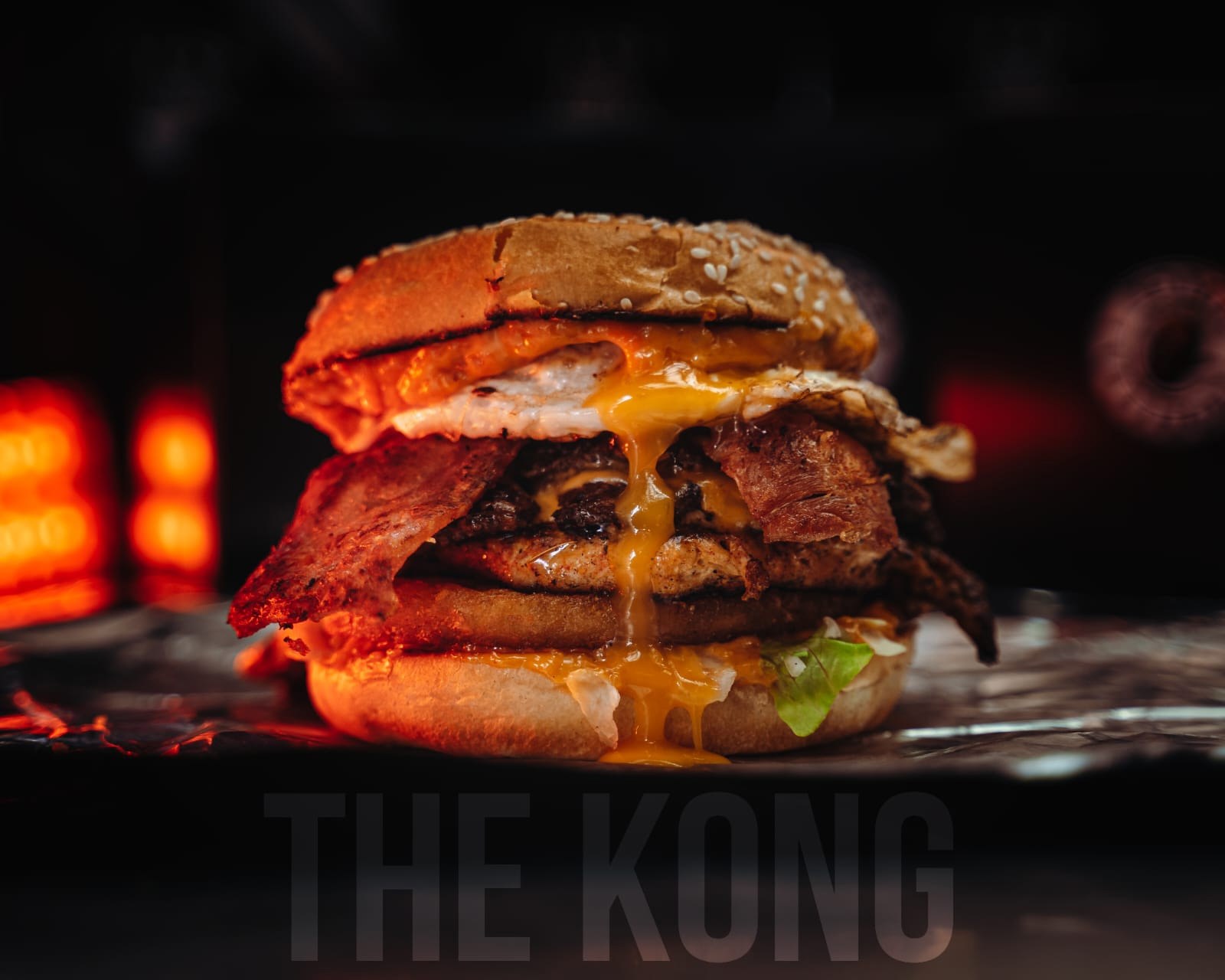 2x 2oz beef patties, crispy onions, beef rashers, tomato, lettuce, gherkins, white cheese & BBQ sauce.